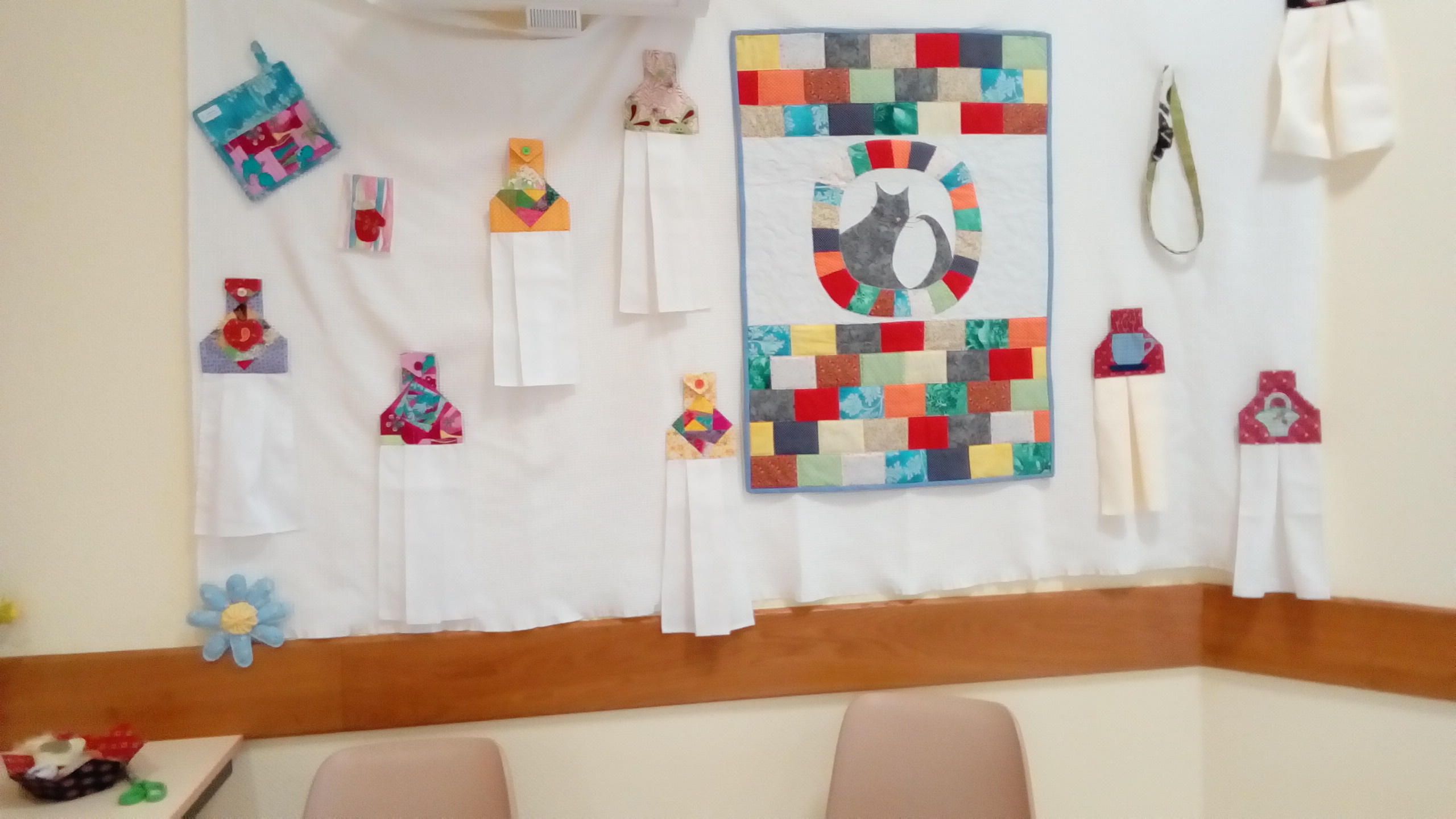 Cette année, nous avons placé la journée sur le thème de la cuisine. En cadeau, nous avons réalisé, pour chacune de nos participantes, une manique dans laquelle était glissé une maxime. Pour continuer sur ce même sujet, l’ouvrage à réaliser concernait un essuie-mains individuel. Très bonne surprise pour nous, aucune de nos «accros» du patch n’avait encore réalisé cet ouvrage.