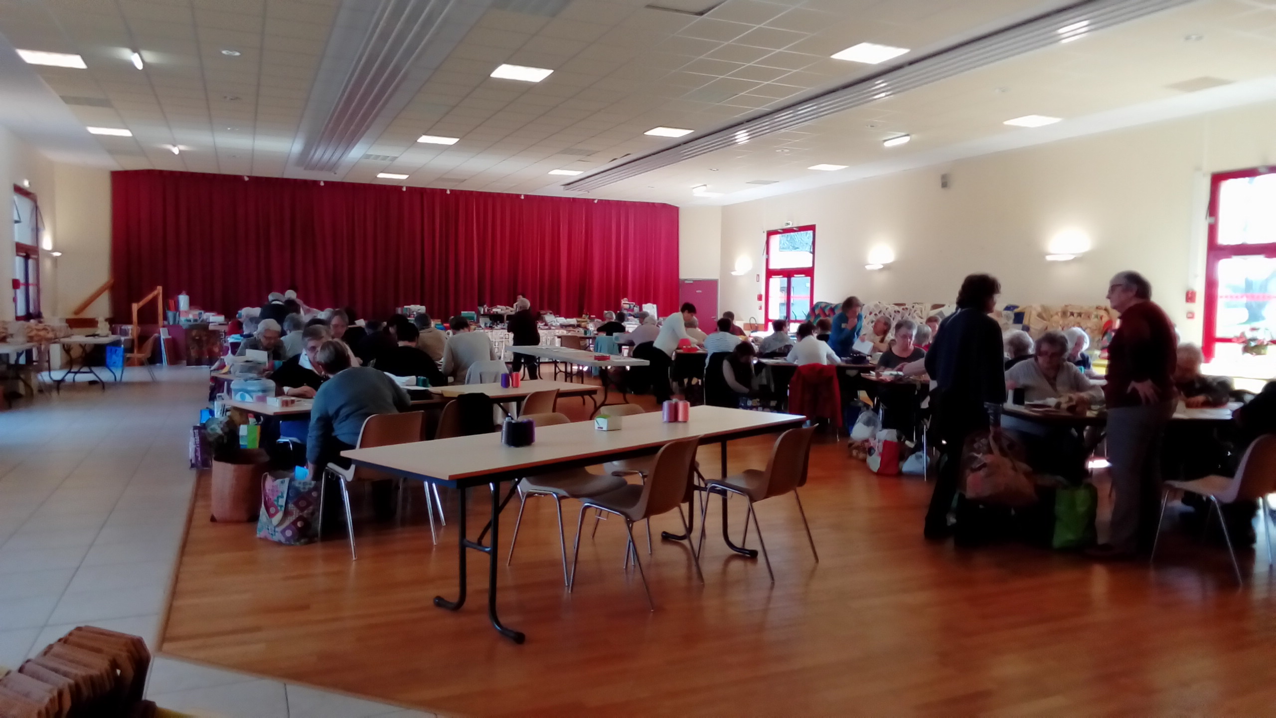 Jeudi 5 avril, la salle des fêtes de la Pépite s’est trouvée envahie par soixantedix dames adeptes de patchwork : c’était la journée interclubs organisée par le club de Jumilhac. Elles sont venues de toute la Dordogne, certaines après 2 heures de trajet. Ah , cette passion! le temps passé en voyage ne compte pas,seul le moment de découvrir l’ouvrage à réaliser est important.