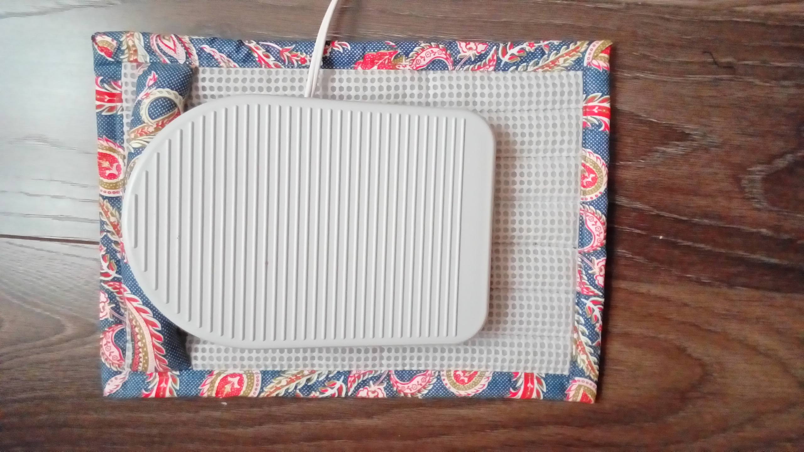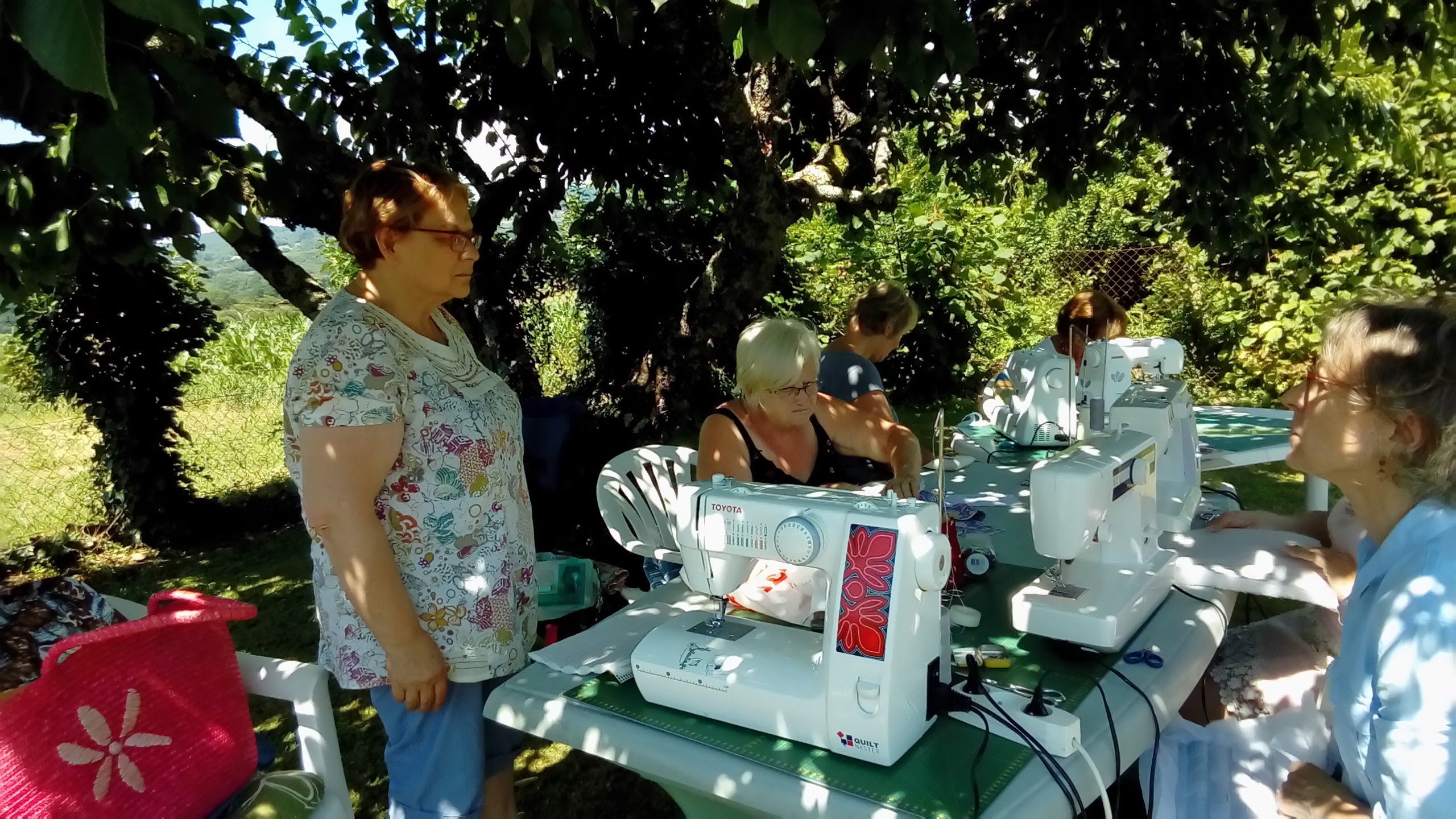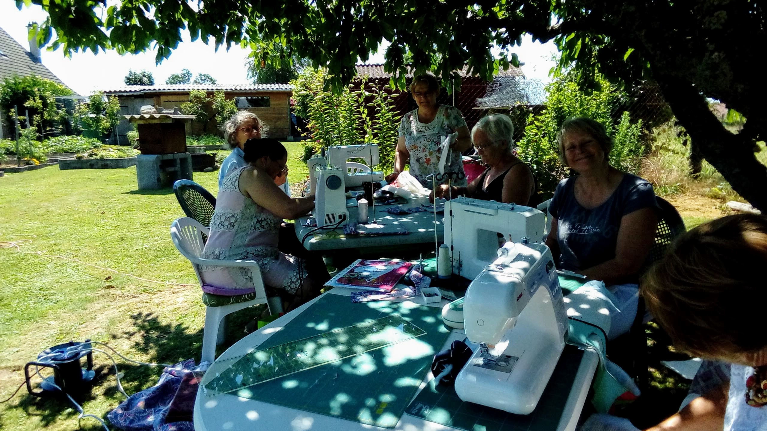 Nous avons eu droit à une journée magnifique, soleil, chaleur, petit vent discret, ce qui nous a permis de coudre au grand air. Tables, chaises, prises électriques, machines à coudre et tout le matériel nécessaire à la patcheuse étant installés, le travail a pu commencer afin de réaliser un « stop-pédale » ( le nom savant, le rhéostat!) pour éviter la recherche de cet accessoire qui a tendance à s’éloigner au fur et à mesure que l’on coud ...